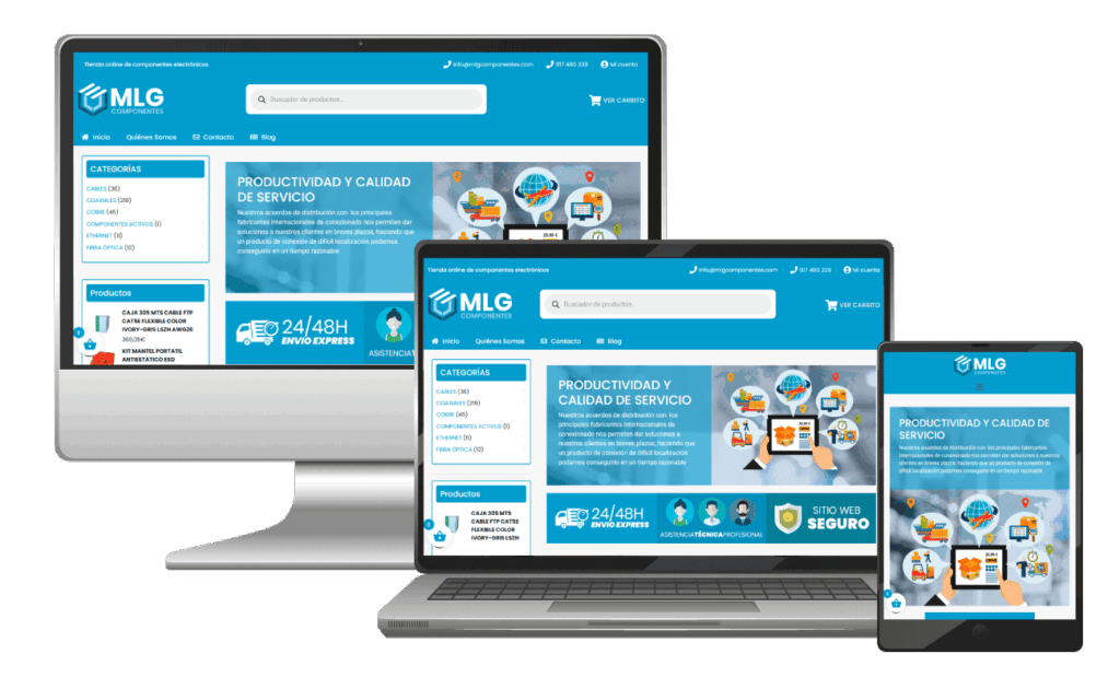 La web se planteó como una tienda online robusta y ordenada, pensada para un público que busca productos concretos y necesita encontrarlos sin perder tiempo. Para ello, se estructuró el catálogo por familias técnicas (cables y alimentación, Ethernet, fibra óptica, coaxiales, componentes activos e informática), con una navegación sencilla y jerarquizada que facilita localizar cada producto por tipo y uso.
